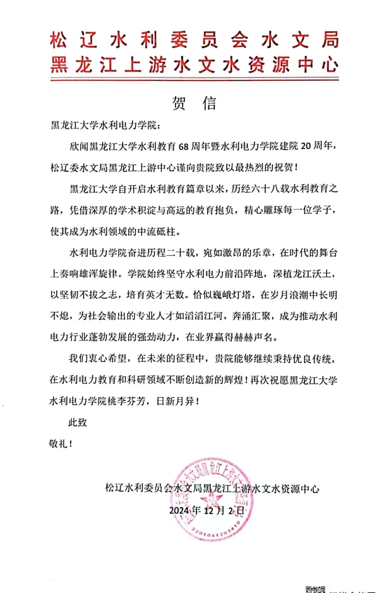 松辽水利委员会水文局黑龙江上游水文水资源中心向公司发来贺信