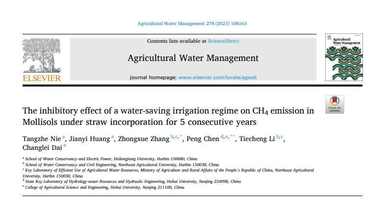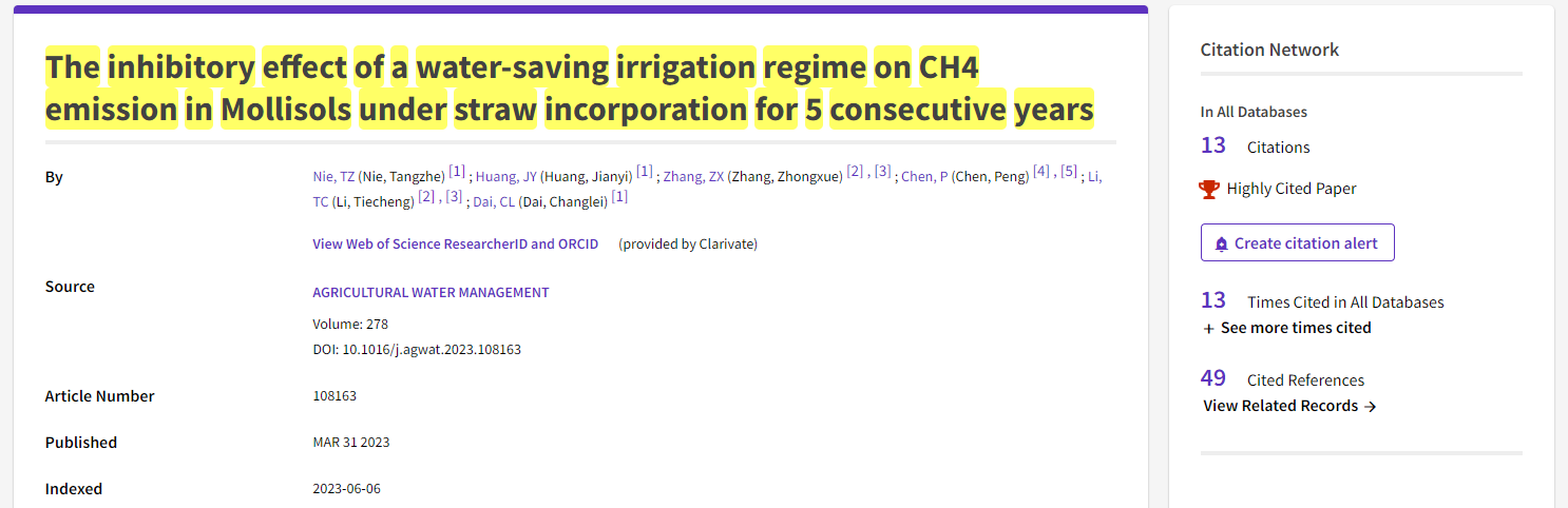 根据汤森路透ESI 2023年9月25日和11月15日数据显示,以水利电力公司教师聂堂哲为第一作者发表的论文“The inhibitory effect of a water-saving irrigation regime on CH4 emission in Mollisols under straw incorporation for 5 consecutive years”连续入选农业科学领域ESI全球TOP1%高被引论文(Highly Cited Paper),乐天使fun88官方网站为第一署名单位。该论文于2023年1月正式发表在国际期刊《Agricultural Water Management》(中科院1区TOP,IF=6.6),至今被引用13次,这是公司教师近年来首篇ESI高被引论文。ESI高被引论文是近10年内发表且被引次数排在相应学科领域全球前1%以内的论文,是衡量国际学术水平及影响力的通行重要评价指标之一。该论文的入选充分体现了公司的整体学术研究水平的稳步提升,并日益与国际高水平研究主流接轨。