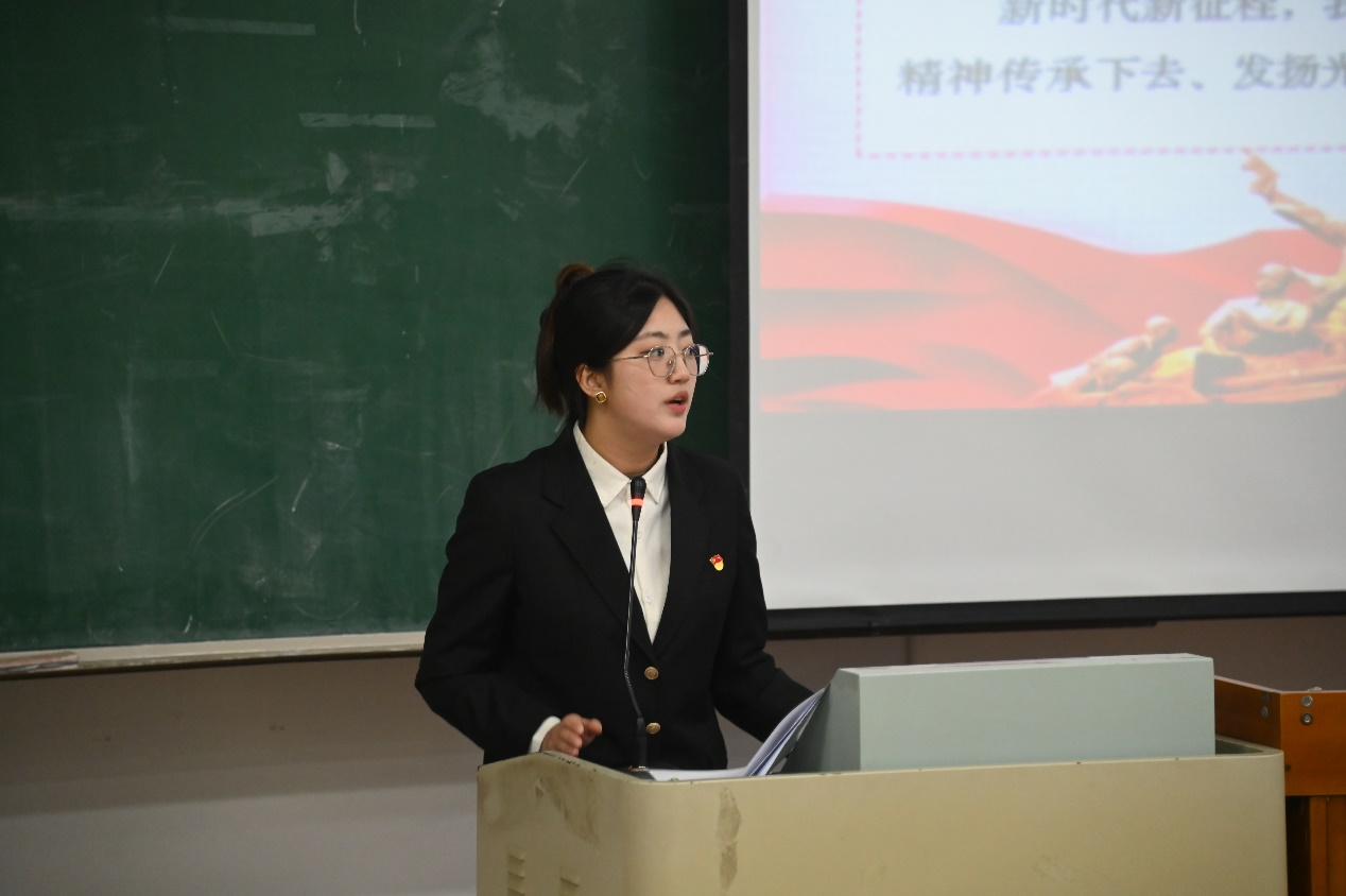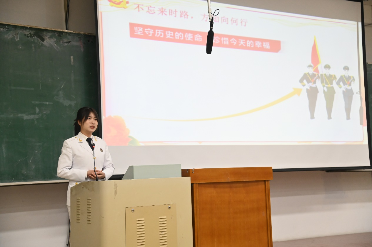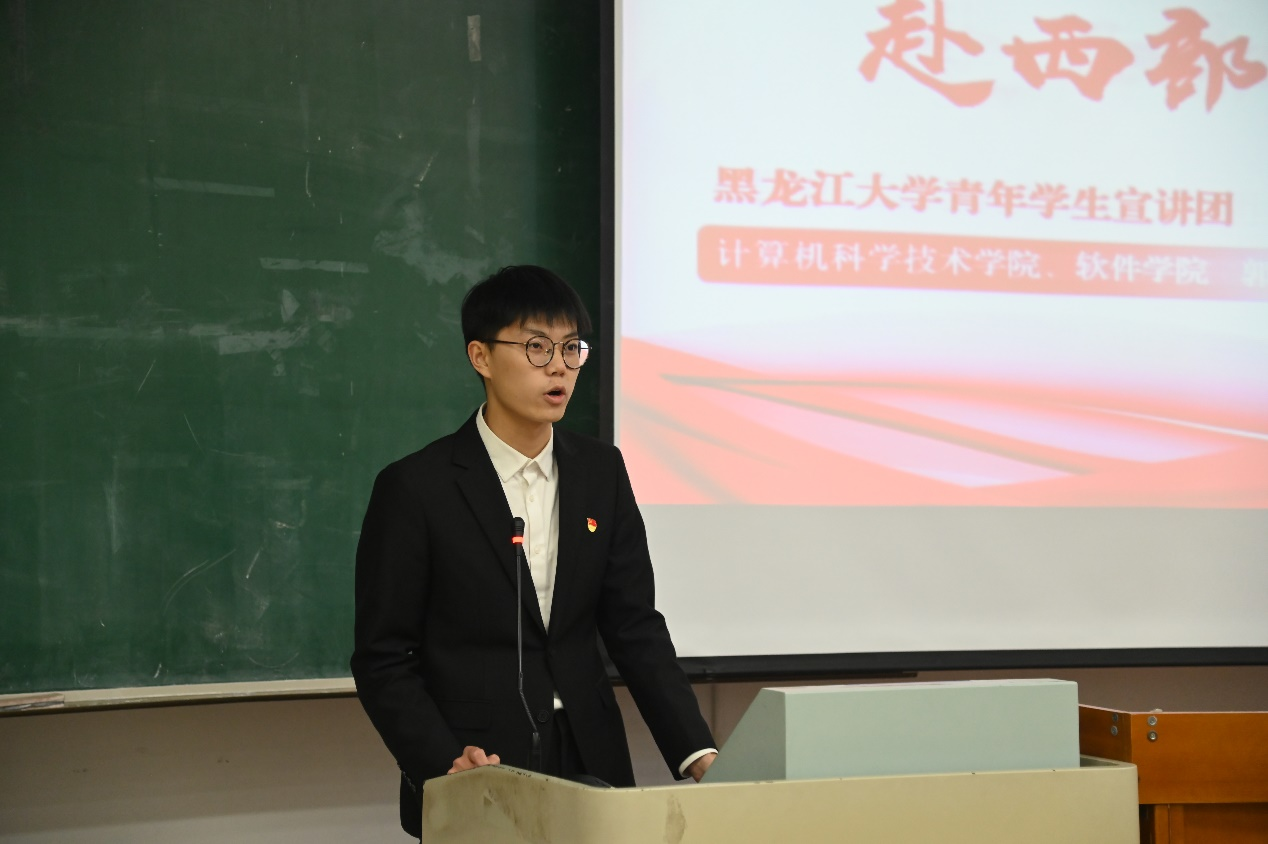 宣讲团成员龚子瑶、高鑫宇、郭曜旸、刁寅峰四位同学围绕学习贯彻习近平总书记重要讲话重要指示精神进行宣讲。龚子瑶同学从国防安全出发,讲述了国防的重要性,呼吁同学们担负起保卫家园的使命;高鑫宇同学围绕东北抗联精神,号召同学们将东北抗联精神这一宝贵财富继续传承下去;郭曜旸同学以自身志愿支教经历为例,呼吁同学们将自身青春热血洒向祖国最需要的贫瘠之地,展现属于志愿实践的魅力;刁寅峰同学结合自身学习生活,引导同学们要刻苦学习,勇于挑战自我,只有通过自身的不懈努力,才能创造无限可能。