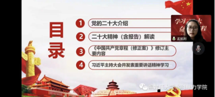 其次,她向我们阐述了在大会中通过的党章修正案,二十大精神核心要义等等。这些内容,体现了党的十九大以来,党的理论创新、实践创新、制度创新成果。对坚持和加强党的全面领导,坚定不移推进从严治党坚持和完善党的建设,推进党的自我革命提出了明确要求。最后,她借用二十大中的内容要求对我们提出了明确希望。为全面建设社会主义现代化国家、全面推进中华民族伟大复兴而团结奋斗!
