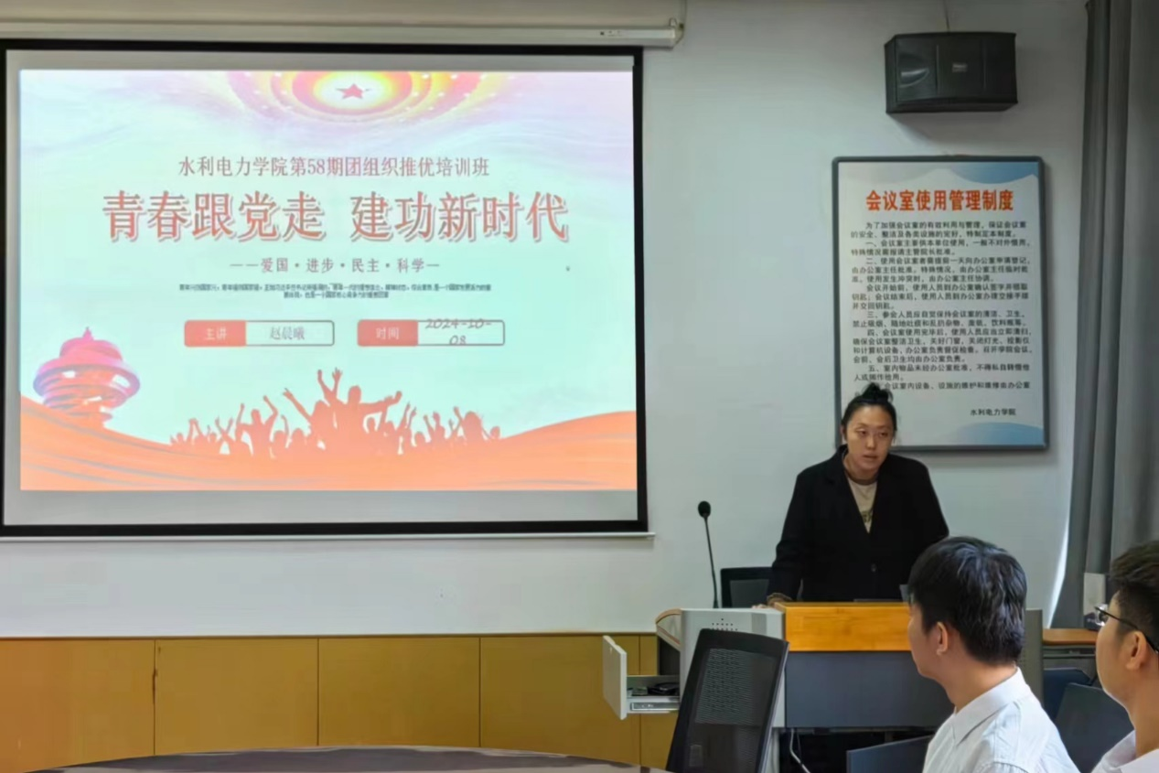 为深入学习贯彻党的二十大精神和党的二十届三中全会精神,引领团员青年认真学习领会习近平新时代中国特色社会主义思想,进一步提升公司团员青年的思想理论水平和政治素养,保持和增强共青团的政治性、先进性、群众性,按照上级团组织要求,水利电力公司于10月8日在水利楼420举办第五十八期共青团“推优”培训班,本期培训班由乐天使团委书记赵晨曦老师主讲,培训班全体学员参加学习。