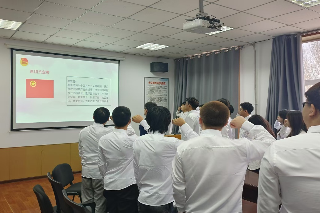 在团旗下,李成鑫同学作为领誓人带领全体新团员举起右拳,庄严宣誓。每一次宣誓都是对自我的一次鞭策,每一声誓言都是对未来的承诺。他们承诺将遵循团的章程,恪守团的纪律,勤学善思,锐意进取,为实现中华民族伟大复兴的中国梦不懈奋斗。随后,史周杰同学带领大家学习《中国共产主义青年团章程》中有关团员的义务和权利,新团员们认真聆听学习。