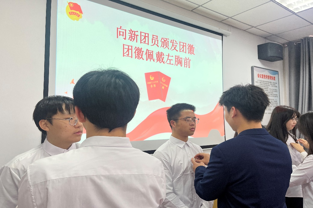 团委部长为新团员佩戴团徽,一枚枚闪耀的团徽被郑重地戴在新团员胸前,象征着荣誉、责任和担当。从佩戴上团徽的那一刻起,新团员们将充分发挥团员的带头作用,用实际行动来成为同学们的榜样模范。