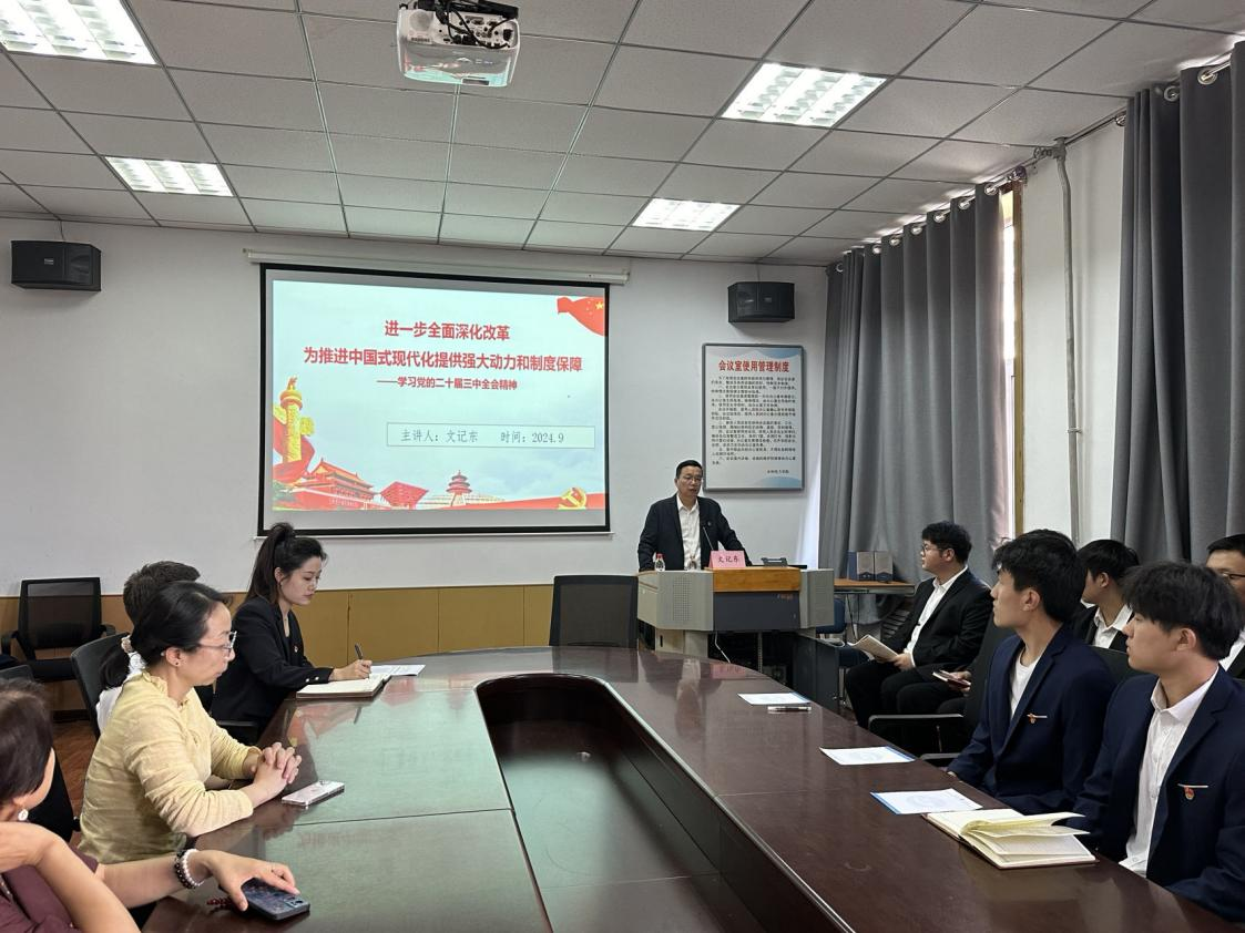为深入学习党的二十届三中全会精神和省委十三届六次全会精神,切实把思想和行动统一到党中央的决策部署上来,推动全会精神在高校落地生根、见行见效,按照公司《关于学习贯彻党的二十届三中全会精神和省委十三届六次全会精神宣讲工作方案》相关要求,9月11日下午,水利电力公司邀请马克思主义公司副经理、集团宣讲团专家文记东在公司420会议室开展了以题为《进一步全面深化改革,为推进中国式现代化提供强大动力和制度保障》的宣讲会。公司党员师生代表参加宣讲会,本次宣讲会由公司党总支副书记刘若男主持。