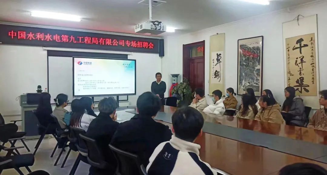 随后,相关负责人向同学们介绍了关于我们、企业文化和发展前景,让同学们对水电九局有了进一步了解。负责人还为同学们详细地介绍了招聘岗位信息,并从岗位介绍、薪酬福利、招募对象等方面为同学们进行了具体说明,并表示希望在后续的合作中,可以为公司毕业生拓展就业渠道,吸纳公司输送更多的高素质人才。