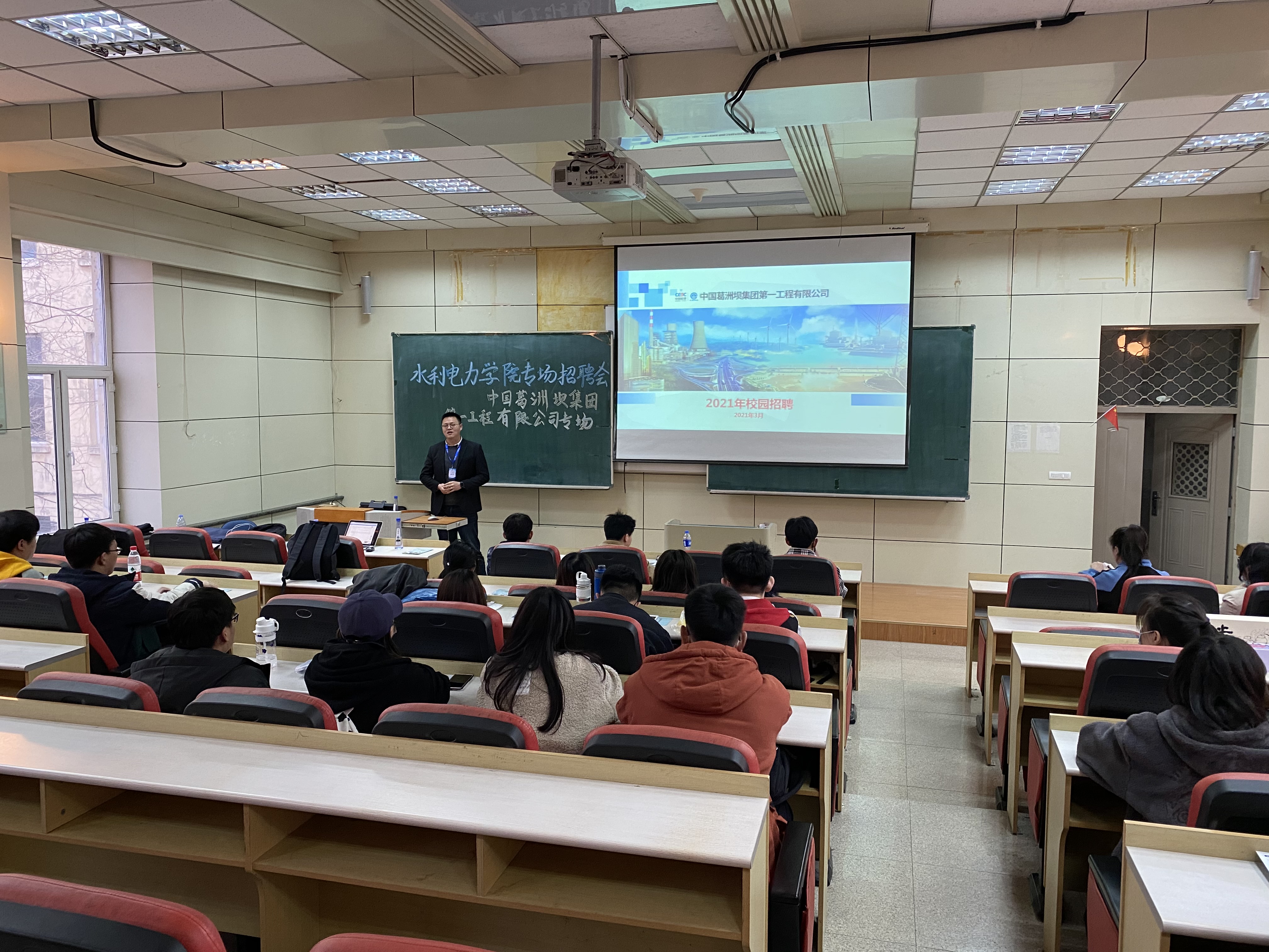 本次招聘会主题为“筑梦未来,建不凡”,首先,招聘方介绍公司的概况:葛洲坝一公司扎根于水利水电工程建设,并进军公路工程、市政工程、环境保护工程领域,是世界水电建设的排头兵,是交通强国的主力军,是城市开发建设的先锋队,是环境保护的践行者,具有国际行业领域知名度。随后,招聘方与同学们分享公司曾参与过的项目。通过项目介绍,让同学们更加了解公司的发展方向与企业文化。紧接着,招聘方以PPT的形式就公司简介、招聘岗位与对象、国内主要项目、新员工成长、职业发展、薪酬福利政策等方面向同学们做了简单的介绍,并现场解答了同学们询问的问题。