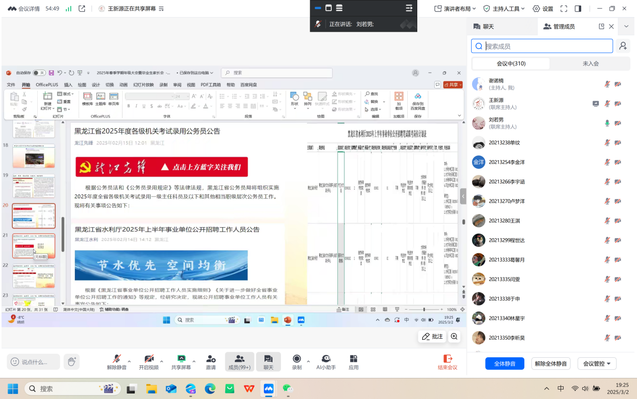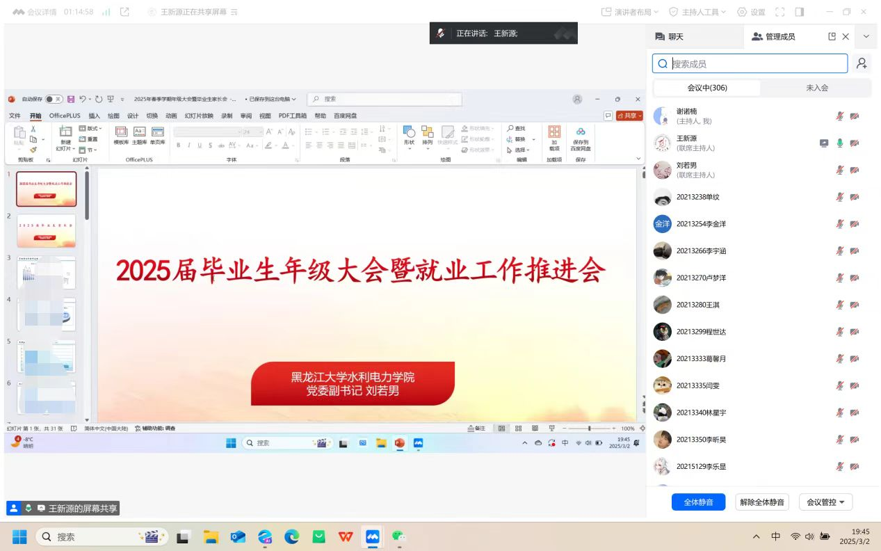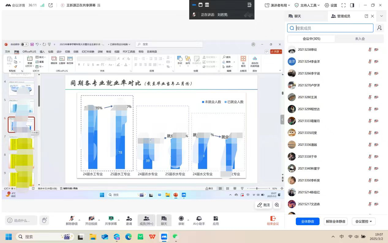 首先,刘若男以详实数据为支撑,通过公司整体阶段性就业数据通报、同期就业总人数对比、各专业就业率对比、校园招聘应届毕业生情况、研究生推免情况以及研究生报考人数及初试统计等情况,详细介绍了公司2025届毕业生目前的就业状态,全面分析了当前就业形势,并针对年级就业、升学、考公等不同类员工人群进行现状分析,提出对策建议。她表示,2025年就业形势较为严峻,岗位竞争尤为激烈,部分企业岗位需求大量缩减,员工和家庭层面,应充分整合各类资源,设立明确可行的升学或求职目标。她强调,毕业生在认真进行毕业设计的同时密切关注本专业就业工作动态,主动与老师们沟通联系,家校齐心,合力育人。